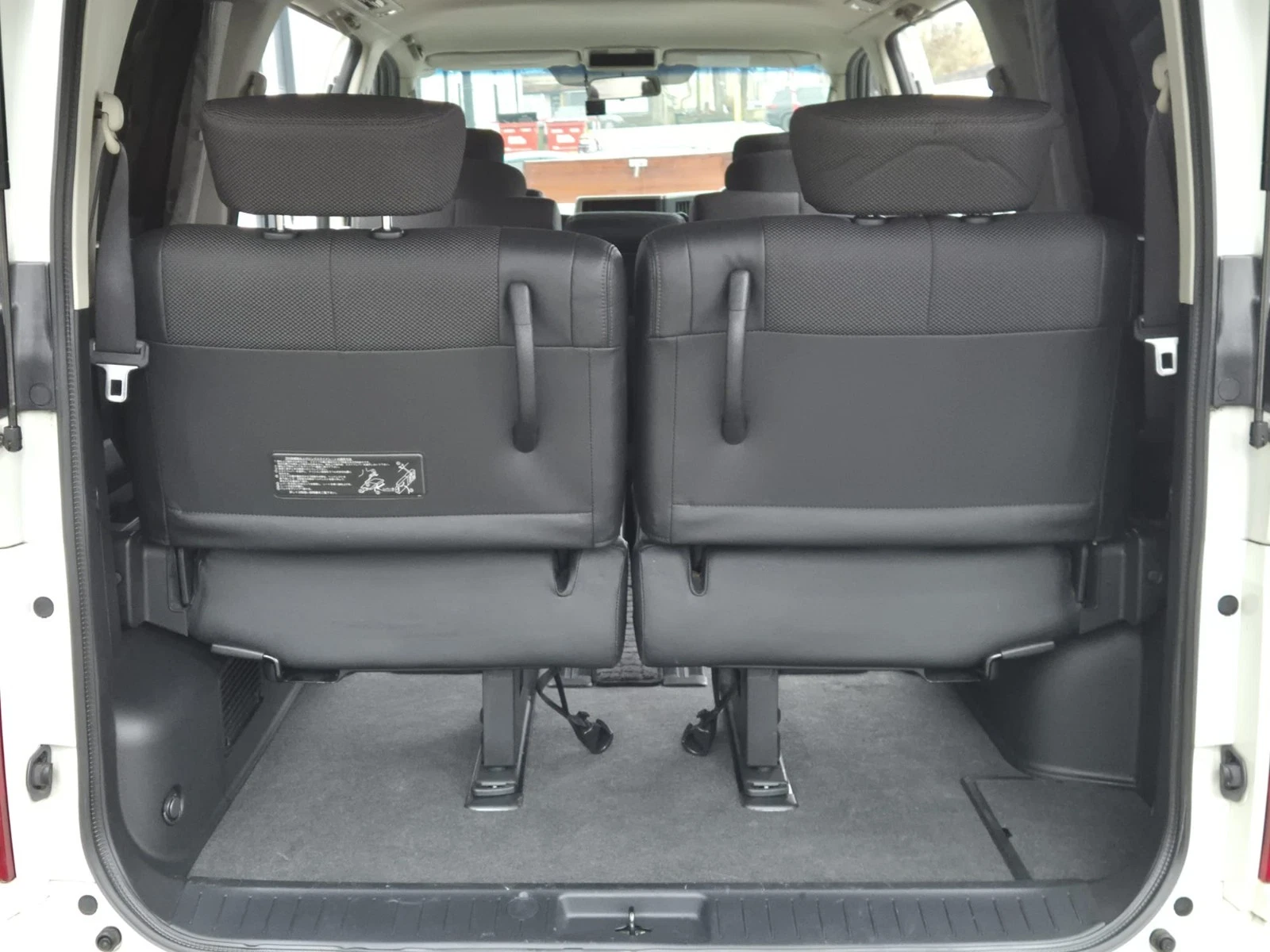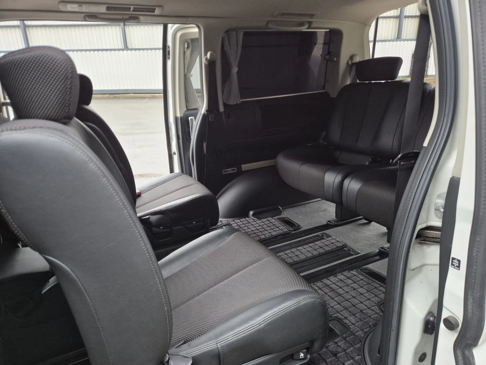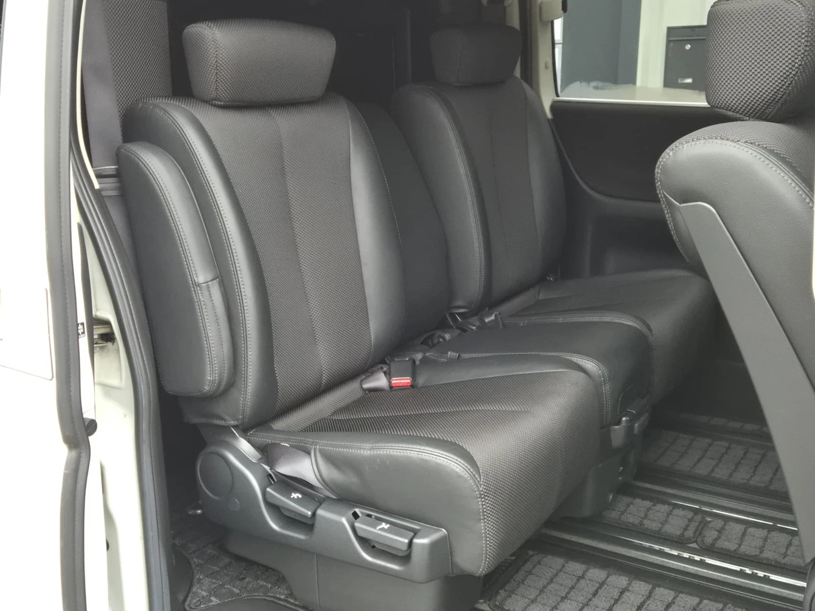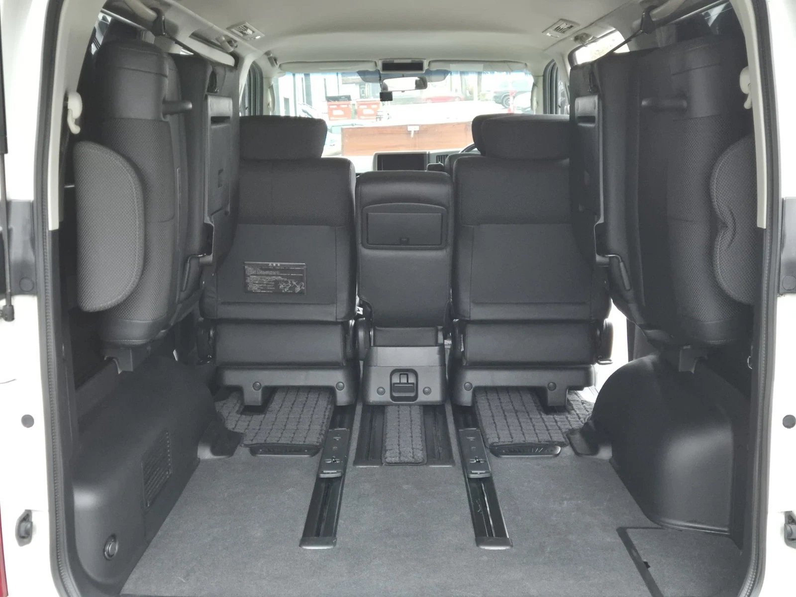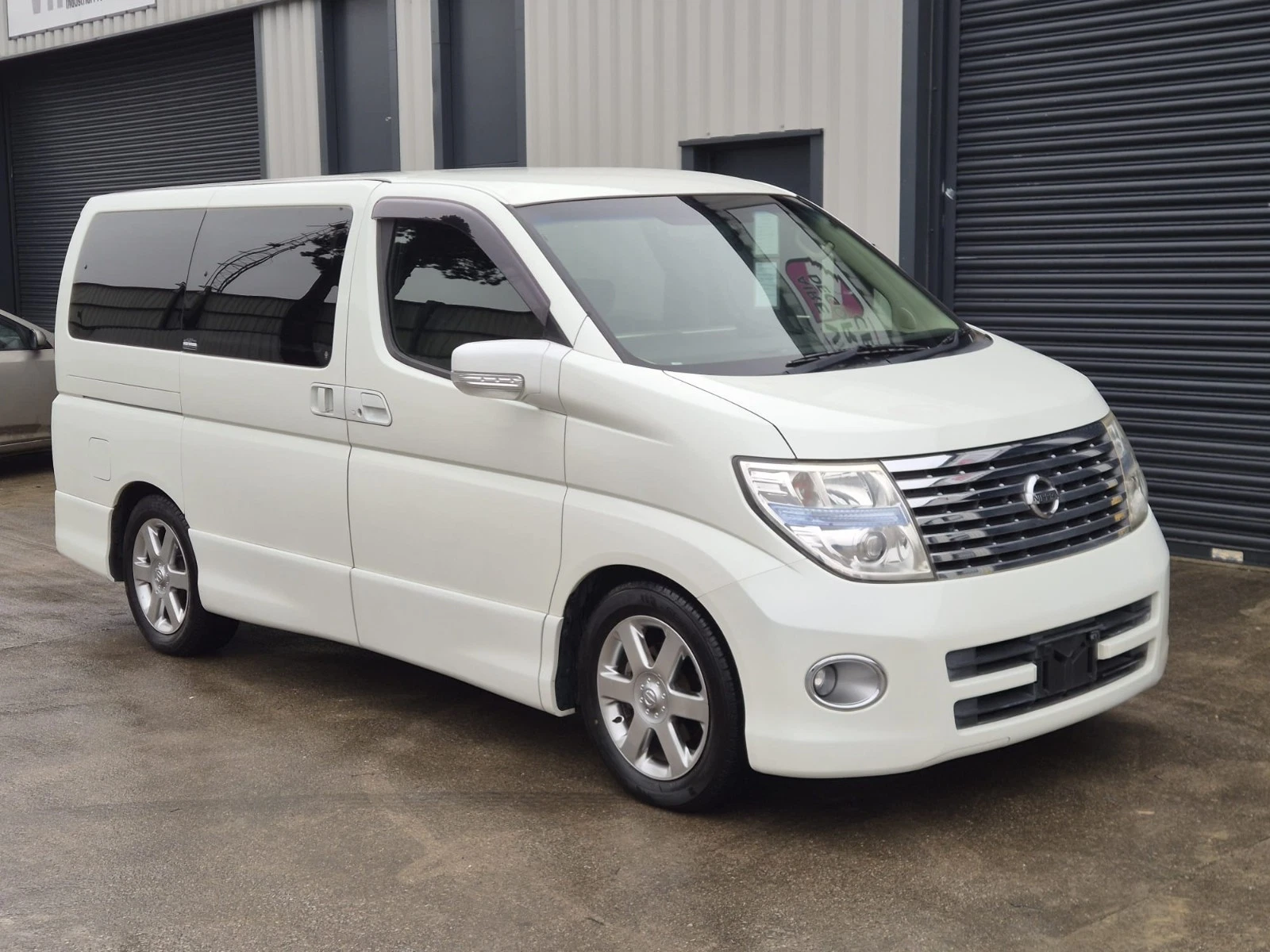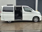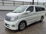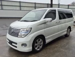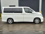 A Nissan Elgrand e51 finished in Pearl white Metallic contrasting with a black leather/cloth interior + folding seats + side camera + alloy wheels + twin power sliding doors + arm rests + cup holders + reverse camera + cd/radio +air con + electric curtains + power windows + electric folding side mirrors + keyless entry +keyless start + folding seats + twin power doors + electric doors mirrors + keyless entry